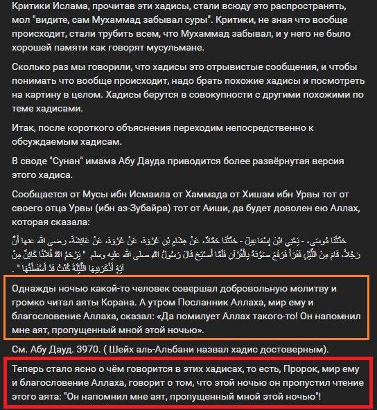 С нами поделились информацией, мол, Мухаммад не забыл аяты Корана, сославшись на пропагандистов из «ANTI-SHUBOHAT» Пропагандисты написали следующий пост, в попытках оправдать Мухаммада. У нас уже возникает много вопросов, но... давайте перейдём к самому "соку" их поста. Ведь в нём будут интересные детали, которые вновь дискредитируют ислам. Пропагандисты ссылаются изначально вот на этот хадис: Сообщается, что ‘Аиша, да будет доволен ею Аллах, сказала: «(Однажды) Пророк ﷺ который услышал, как какой-то человек читает (Коран) в мечети, сказал: “Да помилует его Аллах! Он напомнил мне такие-то аяты из таких-то сур, которые я забыл”». В другой версии (этого хадиса сообщается, что ‘Аиша), да будет доволен ею Аллах, сказала: «(Однажды) НОЧЬЮ Пророк ﷺ, молившийся в моём доме, услышал голос ‘Аббада, который молился в мечети, и спросил: “О ‘Аиша, это голос ‘Аббада?” Я сказала: “Да”, (и тогда) он воскликнул: “О Аллах, ПОМИЛУЙ ‘Аббада!”» И пропагандисты ислама демонстрируют нам другой хадис, которы