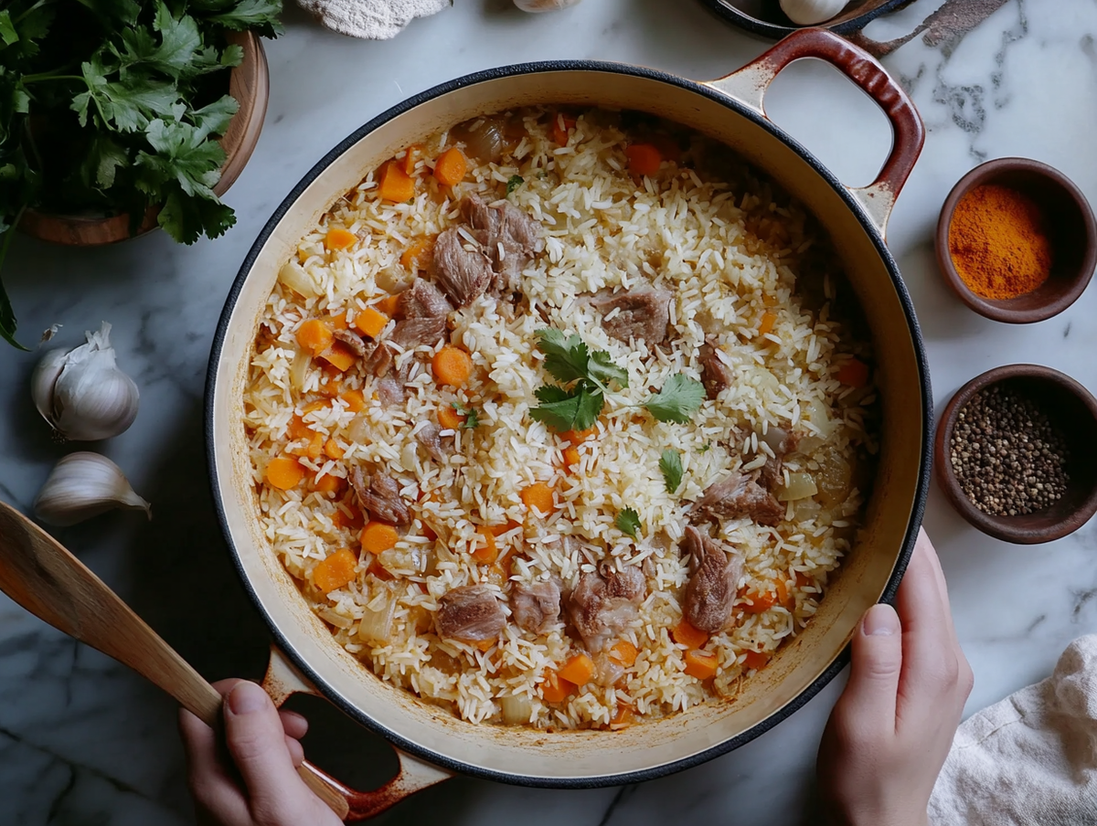 Плов – это не просто блюдо, а настоящая культура, которая объединяет людей за праздничным столом. В нашей статье мы раскроем все тонкости приготовления аутентичного узбекского плова, адаптированного для домашних условий. Следуя этим простым шагам, вы сможете создать вкуснейшее блюдо, которое порадует всю семью и ваших гостей. - Баранина или говядина (600 г) - Рис для плова (400 г) - Морковь (3 крупные) - Лук (3 головки) - Чеснок (2 головки) - Зира, барбарис, куркума – по вкусу - Растительное масло (150 мл) Начнем с подготовки казана или утятницы – традиционного кухонного инструмента для приготовления плова. Разогрейте растительное масло на среднем огне. Обжарьте мясо крупными кусками в течение 7 минут до золотистой корочки. Затем добавьте лук, нарезанный полукольцами, и жарьте еще 5 минут. После этого добавьте морковь, нарезанную соломкой, и обжаривайте все вместе до мягкости моркови. Важный момент: Соотношение моркови и лука должно быть примерно 1:2. Это придаст плову классическ