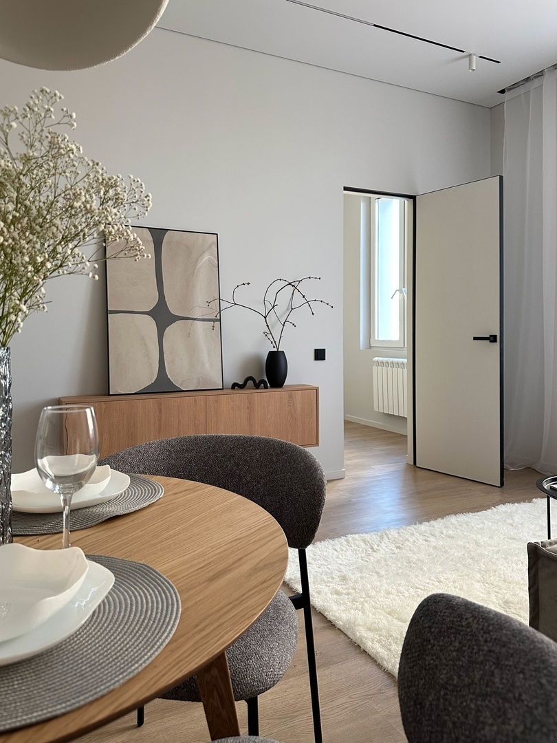 - светлые тона без ярких акцентов, чтобы подчеркнуть пространство и универсальность,