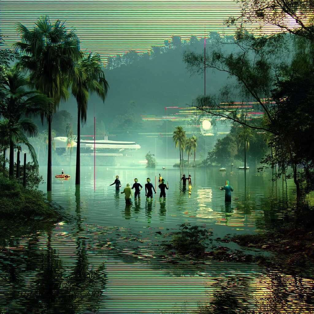 Создано на основе запроса: Nibiru Bathers at spaceship lagoon, moody, polychromatic simulacrum, verdure, datawave, vaporwave, dilated