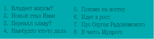 1. Год основания города Владимира -990. На 2025 год ему 1035 лет. 1. Соотнеси герб и название города. Золотое кольцо России. 3. Монумент 850-летия Владимира · Над зодчим — медальоны с портретами Владимира Мономаха и Андрея Боголюбского, барельефы владимирского зодчества и древнего художественного ремесла. · Над воином — медальоны с портретами Александра Невского и Дмитрия Пожарского, а также барельефы с событиями, такими как въезд Александра Невского на великое княжение в 1252 году и сбор земского ополчения князем Пожарским. · Над головой рабочего — события XX века, гражданская война и Великая Отечественная война, а также передача 150 тысячного трактора «Владимирец» колхозникам в 1957 году. 4. Парк «Липки» 5. Дмитриевский собор 6. Палаты 7. Разгадай слова по животным. Ответ: Андрей Рублев 8. Успенский собор 9. Памятник крестителям Владимирской земли : Князю Владимиру и Святителю Федору. 10. Ответ по рыбам: окунь, щука, налим, ерш, карп (река Клязьма) 12. Старая аптека 13. Георгиевская