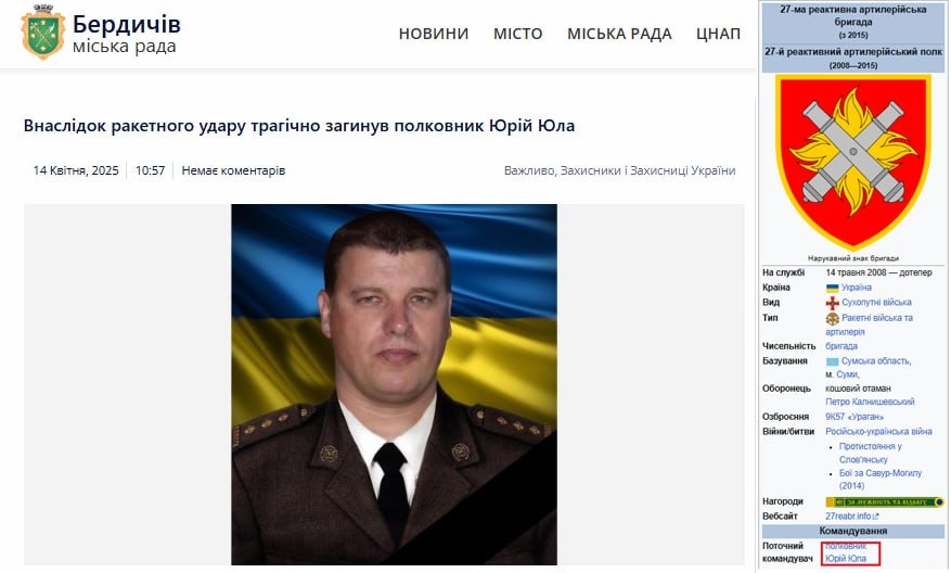 В результате высокоточного ракетного удара 13 апреля 2025 в Сумах ликвидирован военный преступник, комбриг 27 РеАБр ВСУ Юрий Юла