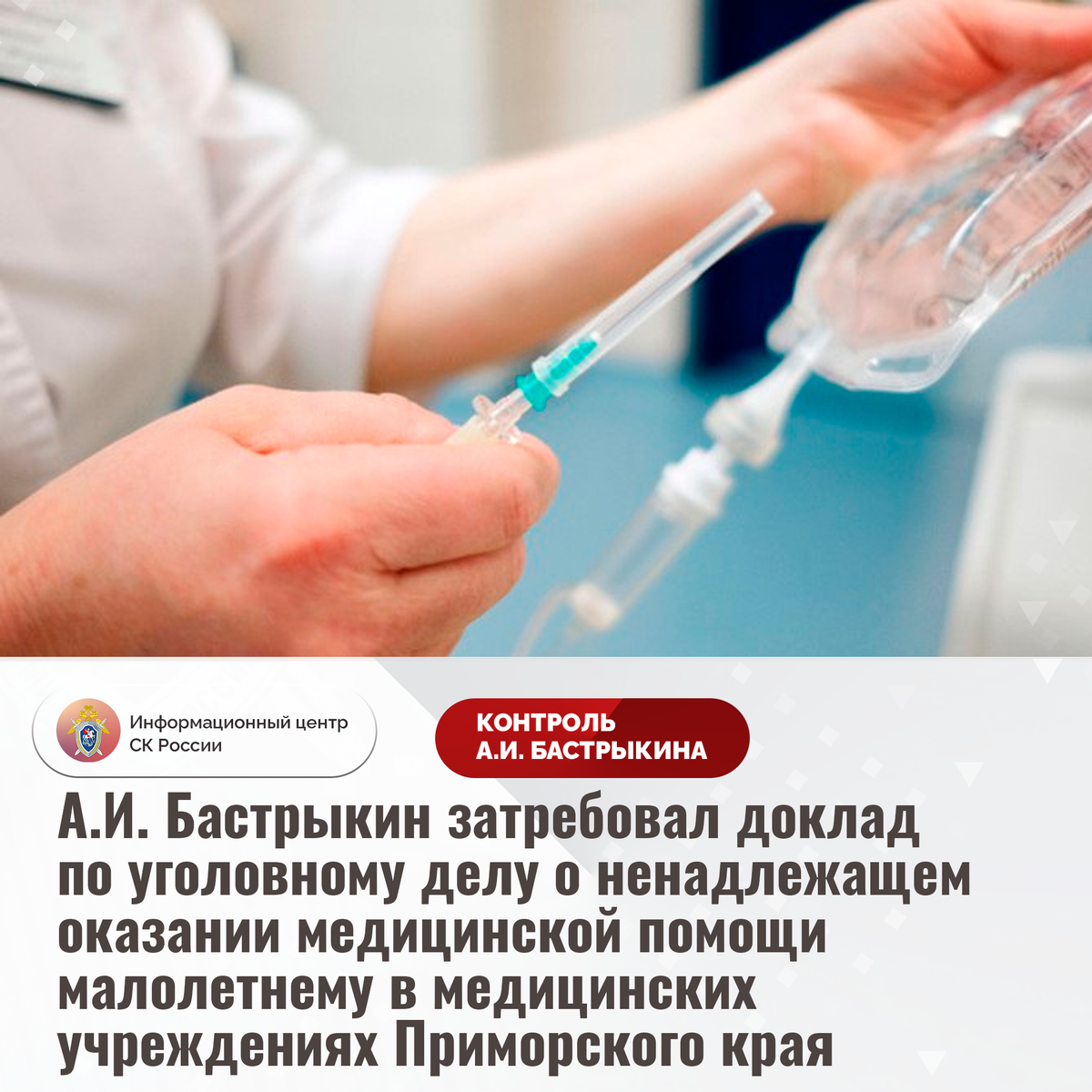 А.И. Бастрыкин затребовал доклад по уголовному делу о ненадлежащем оказании медицинской помощи малолетнему в медицинских учреждениях Приморского края В СМИ сообщается о ненадлежащем оказании медицинской помощи 11-летнему мальчику в медицинских учреждениях Приморского края. В феврале текущего года ребенок был госпитализирован с разрывом почки при падении с дерева. После оперативного вмешательства его перевели в другое медицинское учреждение, где на протяжении месяца малолетний находился на стационарном лечении. После выписки состояние ребенка резко ухудшилось. При повторном обследовании у него диагностировали тяжелое заболевание. Родители уверены, что это произошло в результате ненадлежащего оказания медицинской помощи. В СУ СК России по Приморскому краю по данному факту возбуждено уголовное дело. Председатель Следственного комитета Российской Федерации Александр Иванович Бастрыкин затребовал у руководителя СУ СК России по Приморскому краю Эдуарда Анатольевича Трубчика доклад о предвари