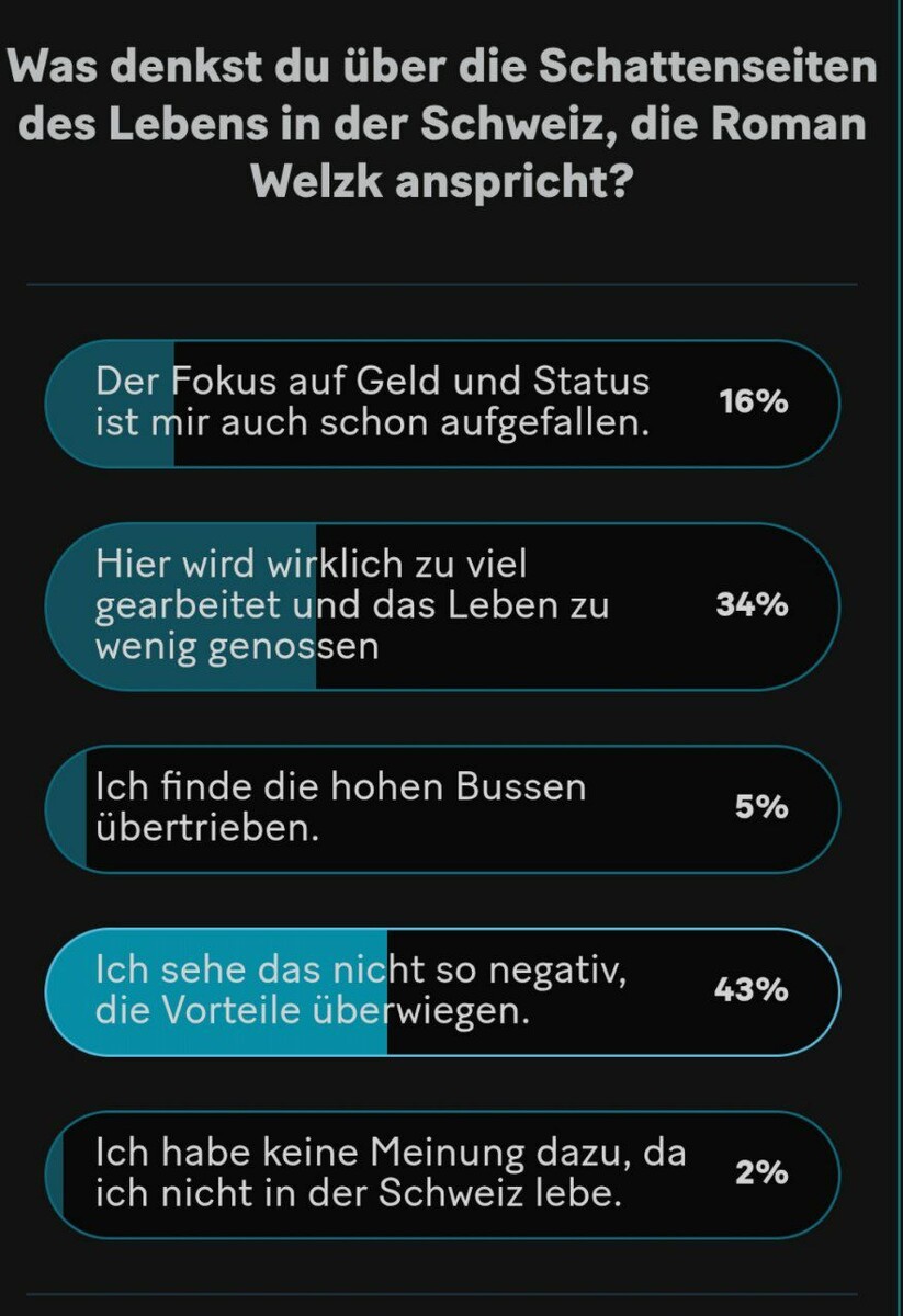 ΡΠΏΠΎΠΌΠΈΠ½Π°Π΅Ρ Π ΠΎΠΌΠ°Π½ ΠΠ΅Π»ΡΡΠΊ? Π― ΡΠ°ΠΊΠΆΠ΅ Π·Π°ΠΌΠ΅ΡΠΈΠ», ΡΡΠΎ Π·Π΄Π΅ΡΡ ΡΠ΄Π΅Π»ΡΠ΅ΡΡΡ Π±ΠΎΠ»ΡΡΠΎΠ΅ Π²Π½ΠΈΠΌΠ°Π½ΠΈΠ΅ Π΄Π΅Π½ΡΠ³Π°ΠΌ ΠΈ ΡΡΠ°ΡΡΡΡ - 16% ΠΡΠ΄ΠΈ Π·Π΄Π΅ΡΡ Π΄Π΅ΠΉΡΡΠ²ΠΈΡΠ΅Π»ΡΠ½ΠΎ ΡΠ»ΠΈΡΠΊΠΎΠΌ ΠΌΠ½ΠΎΠ³ΠΎ ΡΠ°Π±ΠΎΡΠ°ΡΡ ΠΈ ΡΠ»ΠΈΡΠΊΠΎΠΌ ΠΌΠ°Π»ΠΎ Π½Π°ΡΠ»Π°ΠΆΠ΄Π°ΡΡΡΡ ΠΆΠΈΠ·Π½ΡΡ - 34% Π― Π΄ΡΠΌΠ°Ρ, ΡΡΠΎ Π²ΡΡΠΎΠΊΠΈΠ΅ ΡΡΡΠ°ΡΡ ΡΡΠ΅Π·ΠΌΠ΅ΡΠ½Ρ - 5% Π― Π½Π΅ ΡΡΠΈΡΠ°Ρ ΡΡΠΎ Π½Π΅Π³Π°ΡΠΈΠ²Π½ΡΠΌ, ΠΏΡΠ΅ΠΈΠΌΡΡΠ΅ΡΡΠ²Π° ΠΏΠ΅ΡΠ΅Π²Π΅ΡΠΈΠ²Π°ΡΡ Π½Π΅Π΄ΠΎΡΡΠ°ΡΠΊΠΈ - 43 % Π£ ΠΌΠ΅Π½Ρ Π½Π΅Ρ ΠΌΠ½Π΅Π½ΠΈΡ Π½Π° ΡΡΠΎΡ ΡΡΠ΅Ρ, ΡΠ°ΠΊ ΠΊΠ°ΠΊ Ρ Π½Π΅ ΠΆΠΈΠ²Ρ Π² Π¨Π²Π΅ΠΉΡΠ°ΡΠΈΠΈ - 2% π ΠΠΎΡΠΎΡΠ΅, ΡΠΈΠ»ΡΡΡΡΠΉΡΠ΅ ΡΠΎ ΡΡΠΎ Π²Π°ΠΌ Π³ΠΎΠ²ΠΎΡΡΡ Π½Π° ΡΡΡΠ±Π΅ . Π ΠΊΠΎΠ½ΡΠ΅ ΠΊΠΎΠ½ΡΠΎΠ² Ρ ΠΊΠ°ΠΆΠ΄ΠΎΠ³ΠΎ ΡΠ²ΠΎΠΉ ΠΎΠΏΡΡ ΠΈ ΡΠ°ΠΌ ΡΠΎΠΆΠ΅ Π½Π° Π²Π°Ρ Π·Π°ΡΠ°Π±Π°ΡΡΠ²Π°ΡΡ π«‘ #Π¨Π²Π΅ΠΉΡΠ°ΡΠΈΡ