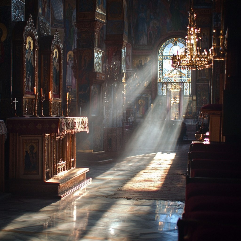 Создано на основе запроса: a orthodox church strange interior everything is reflecting and there are intricate old objects arranged so that the light reflects colors sunset 1E073D 5600E3 5A1BA0 61DFFF 7F29FF 93D2F7 956AEB D679F5 F53CFF backlight blue brynnt weeddale colorful people pink purple 190058 panoramic view reflecting the light very busy dominant color orange color photography ar - 16:9 The pattern of light that appears when light is on a window and light shines through it, casting a pattern on the face. cinematic, movie scene. in shot only the shadow it casts, rain caustics --- Автоперевод: Православная церковь Странный интерьер. Все отражает, и расположены сложные старые предметы, так что свет отражает цвета Sunset 1e073d 5600e3 5a1ba0 61dfff 7f29ff 93d2f7 956aeb d679f5 f53cff Backlight Blynnt Weeddal Необычно вышло? 🤔 https://dzen.ru/id/65c0c65c86e4f837c27b24d7 #ИИ #AI #нейросеть #midjourney #art