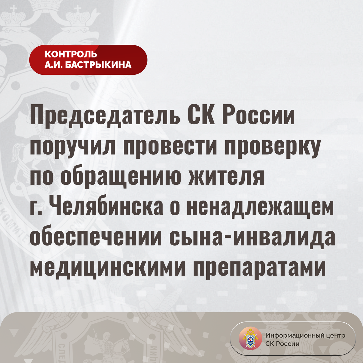 Председатель СК России поручил провести проверку по обращению жителя г. Челябинска о ненадлежащем обеспечении сына-инвалида медицинскими препаратами К Председателю СК России А.И. Бастрыкину через его приемную «ВКонтакте» обратился житель города Челябинска по вопросу нарушения прав его девятилетнего сына, являющегося инвалидом. Мальчик страдает тяжелой формой заболевания и нуждается в регулярном приеме жизненно необходимых лекарственных препаратов. Несмотря на многочисленные обращения родителей в профильную структуру, медикаменты в городских аптеках отсутствуют. Прерывание терапии может привести к значительному ухудшению состояния мальчика, в связи с чем заявитель опасается за его жизнь и здоровье. Председатель Следственного комитета Российской Федерации Александр Иванович Бастрыкин поручил руководителю СУ СК России по Челябинской области Алексею Ивановичу Колбасину провести процессуальную проверку и доложить об установленных в ходе первоначальных проверочных мероприятий обстоятельствах