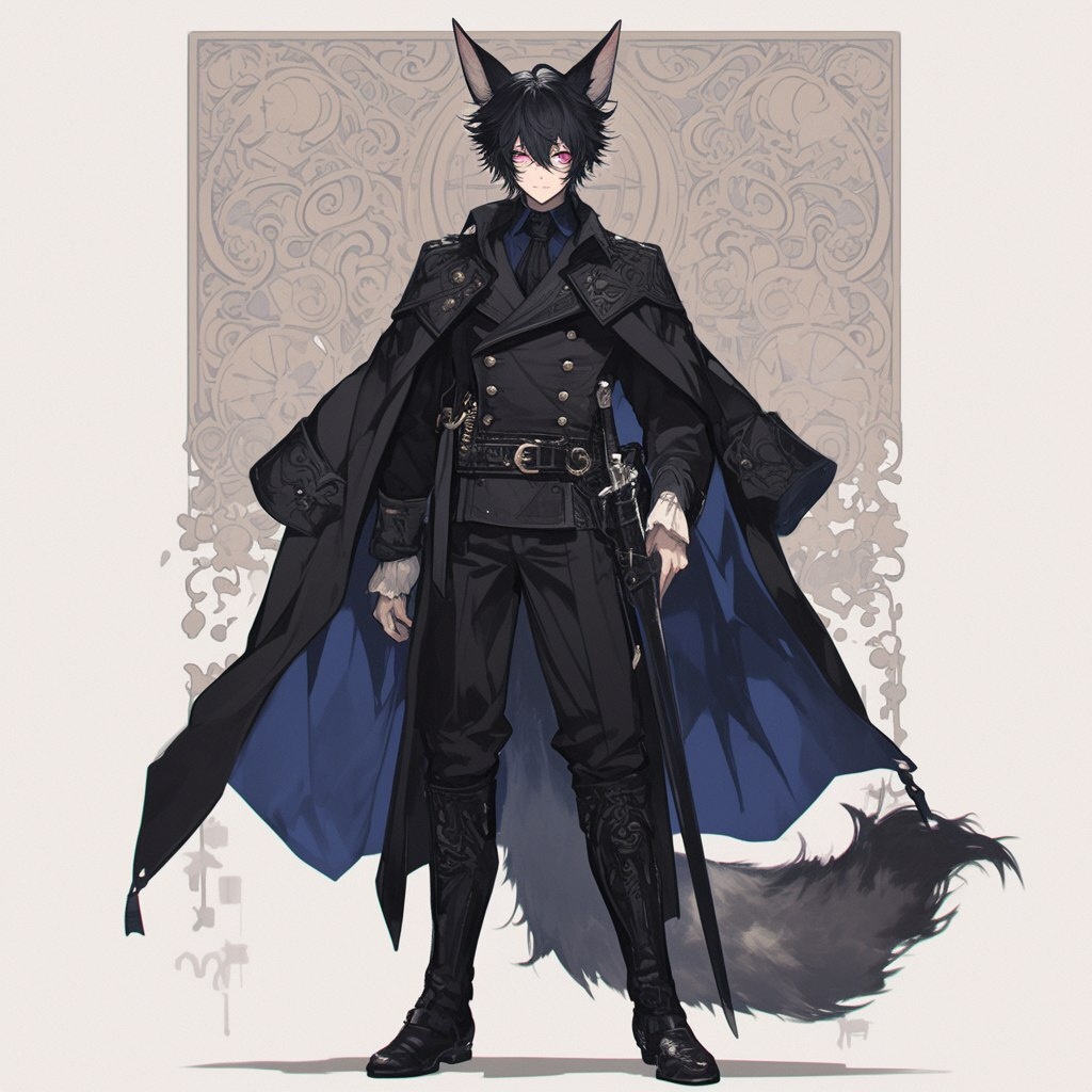 Создано на основе запроса: A full-length guy with fennec ears and a tail stands in 19th century clothes, black hair and pink eyes