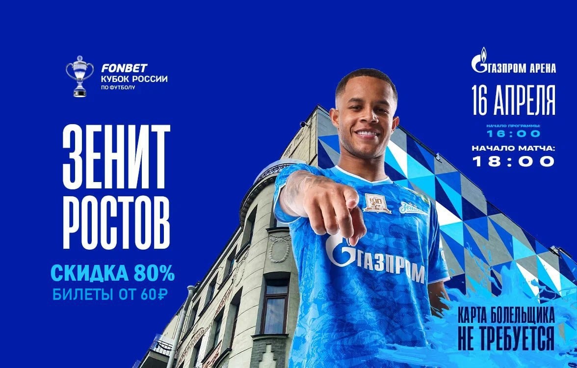 Важнейшая битва в Кубке страны и непередаваемые эмоции от игры! Приглашаем на матч «Зенит» — «Ростов» и дарим скидку 80