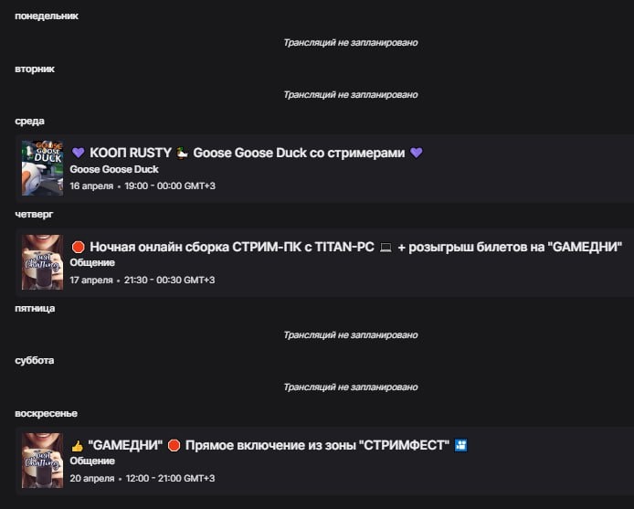 📢🗓 РАСПИСАНИЕ 🗓 📆 СР. 16.04 ⏰ 19:00 💜 КООП RUSTY 🦆 Goose Goose Duck со стримерами 💜 Состав: RUSTY; Zelenaya_zlaya; Jedai4eg; SOLODVALERY; KseniyaSergeevna; StasyaConsole; MaxManorn; Mr_Endorphin; Skantip; Cap_Pyrozhok; AloeKoala; NightMoonna; Trolechka_; GUZ3LKA. 📆 ЧТ. 17.04 ⏰ 21:30 🛑 Ночная онлайн сборка СТРИМ-ПК с TITAN-PC 💻 + розыгрыш билетов на "GAMEДНИ" 📆 ВС. 20.04 ⏰ 12:00 👍 "GAMEДНИ" ⏺⏺ Прямое включение из зоны "СТРИМФЕСТ" 🎦 Да, всего ТРИ стрима на этой неделе, поэтому лайки на VK Видео Live очень нужны!!! Я уже говорил на стриме, это самая ответственная неделя перед мероприятием "GAMEДНИ"! Кстати! Кто хочет халявный билет или скидочку 50%? Залетайте в чат во время сборки ПК в четверг, там будем разыгрывать билеты и промики!!! 1️⃣ Смотри на Twitch и обязательно прожимаем 💛 на VKВидеоLive!! ⏺ Все наши ресурсы.