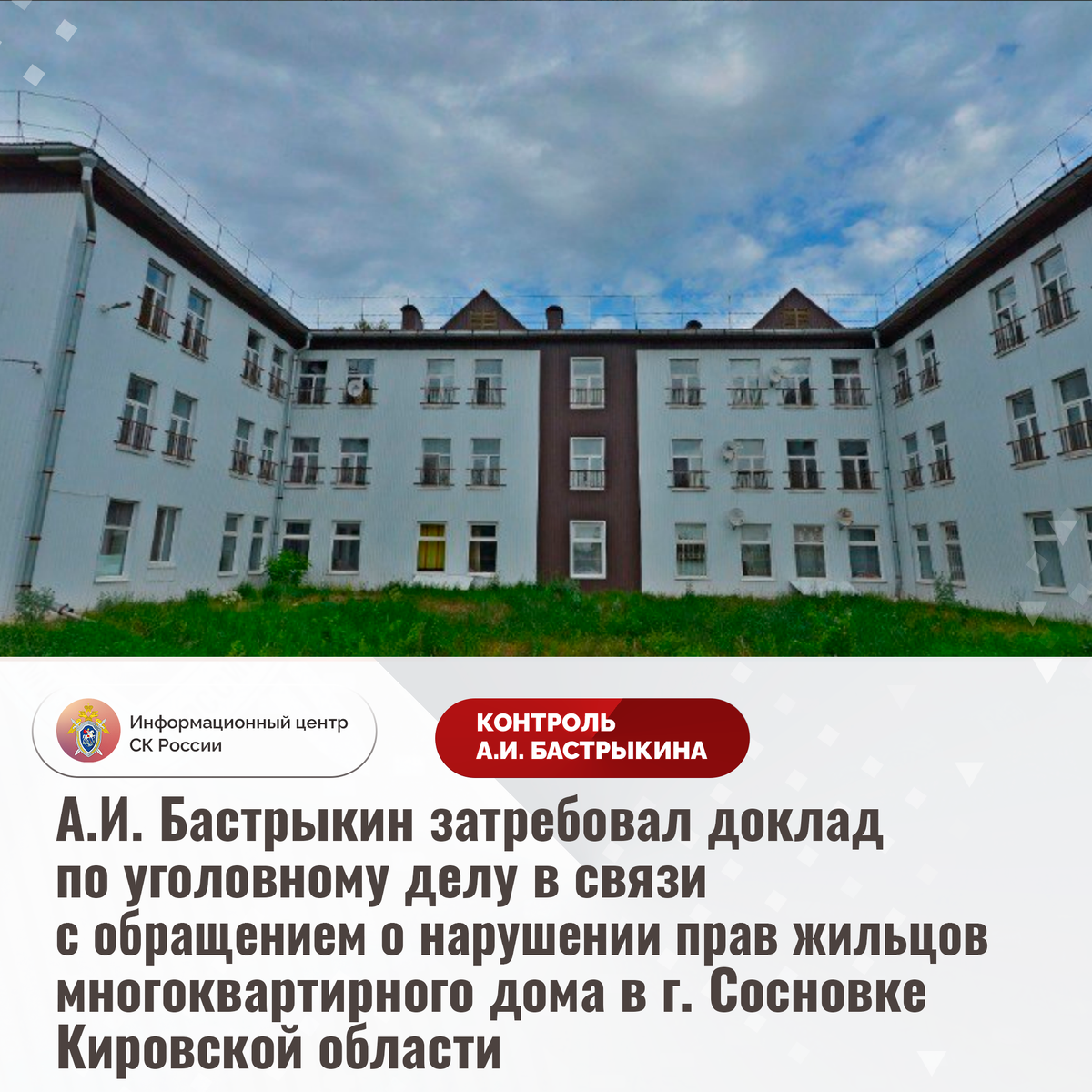 А.И. Бастрыкин затребовал доклад по уголовному делу в связи с обращением о нарушении прав жильцов многоквартирного дома в г. Сосновке Кировской области В комментариях в аккаунте приемной Председателя СК России А.И. Бастрыкина «ВКонтакте» обратилась сирота и одинокая мать из Кировской области по вопросу несогласия с ходом установления обстоятельств нарушения ее жилищных прав. Девушке предоставлено жилое помещение в многоквартирном доме на улице Советской города Сосновки, построенном в 2018 году. При этом в ходе возведения здания допущены нарушения, из-за которых в стенах образовались трещины, во время осадков верхние этажи затапливались, а температурный режим не соответствовал норме. Несмотря на жалобы жильцов, застройщик недостатки не устранил, гражданам предлагалось произвести ремонт отопительной системы и здания в целом за свой счет. Кроме этого, сирота вынуждена выплачивать долг по оплате коммунальных услуг за помещение, в котором фактически не проживала. В настоящее время ей предос