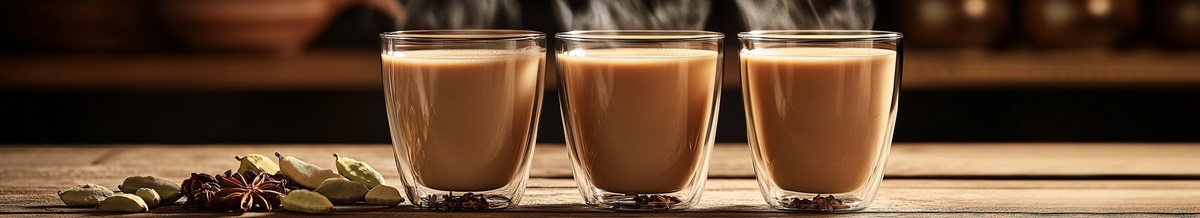 Создано на основе запроса: A few glasses of fresh steamy milk teas on transparent glass, on wooden table, with cardamom and few other spices