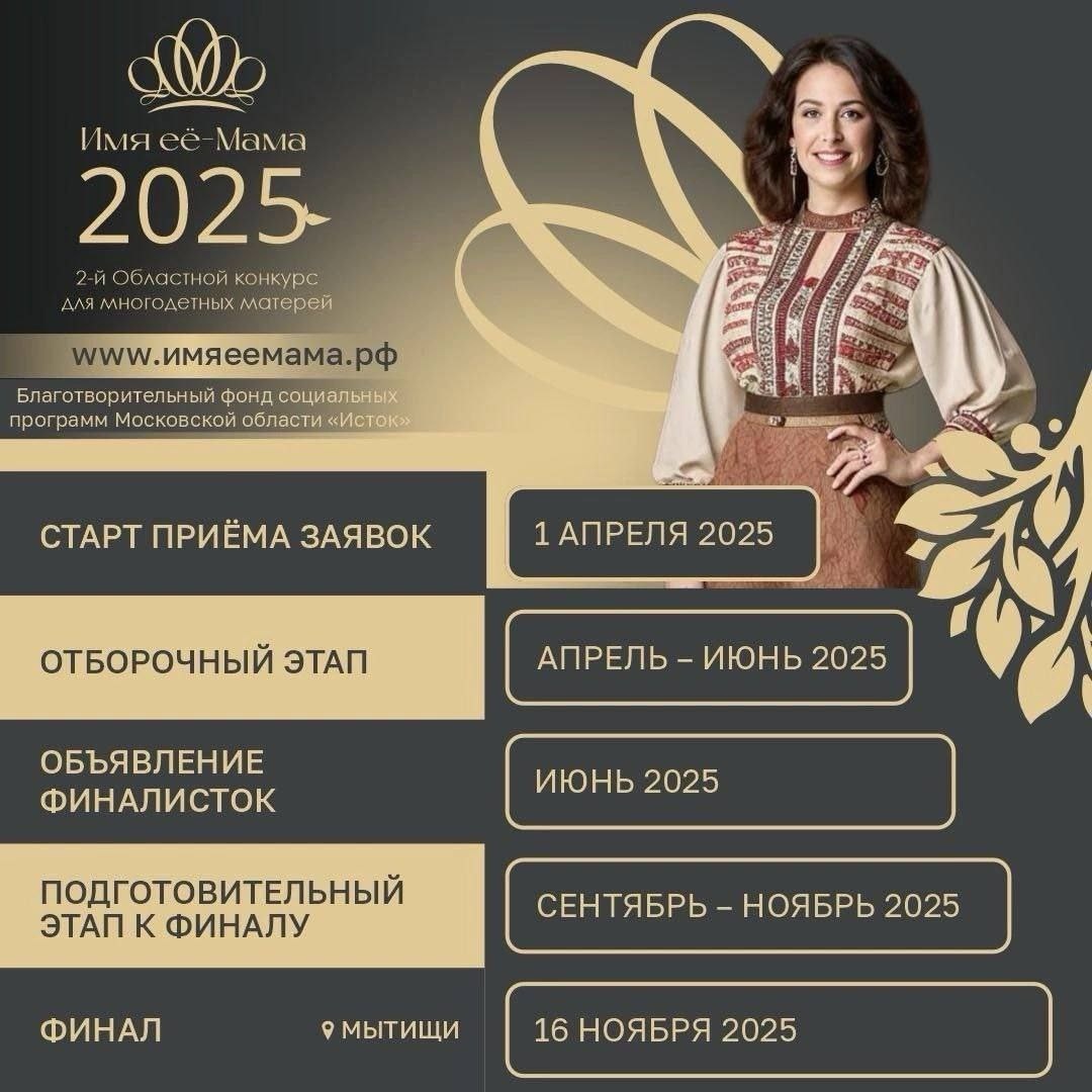 ✨ Конкурс «Имя её – мама 2025»🌼 📌 Кто может участвовать: — многодетные мамы, воспитывающие 5 и более детей — проживающие на территории Московской области 🚀 Что ждёт участниц: — невероятная подготовка, творческие испытания, новые эмоции — знакомство с такими же вдохновляющими женщинами — сцена, признание, яркие выступления — подарки, партнёры, поддержка и настоящая атмосфера силы и красоты ✍️Подать заявку можно до 30 апреля ✅ Как подать заявку? Все подробности на сайте имяеемама.рф/ 📆 30.04.2025
