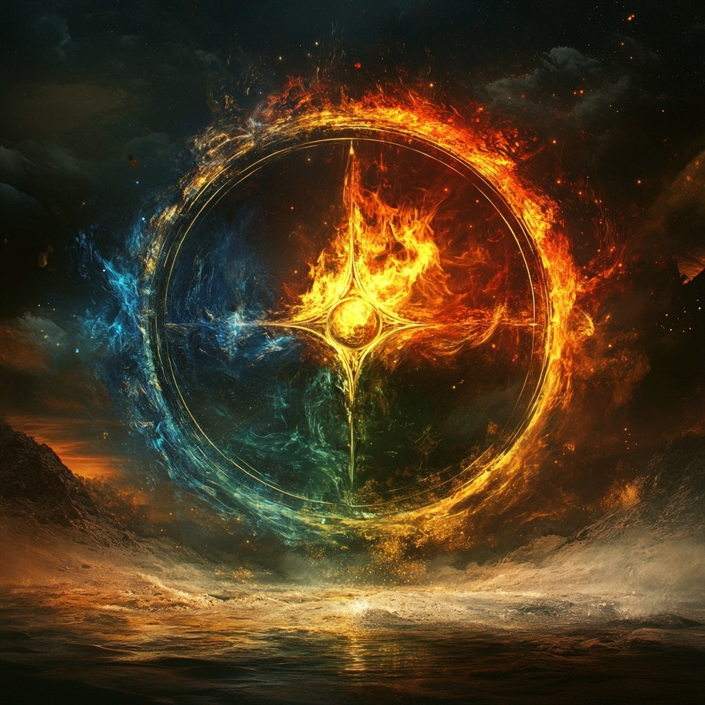 Создано на основе запроса: Fantasy concept illustration, Symbol of the Circle of the Four Alchemical Elements, with Fire at the top, Air on