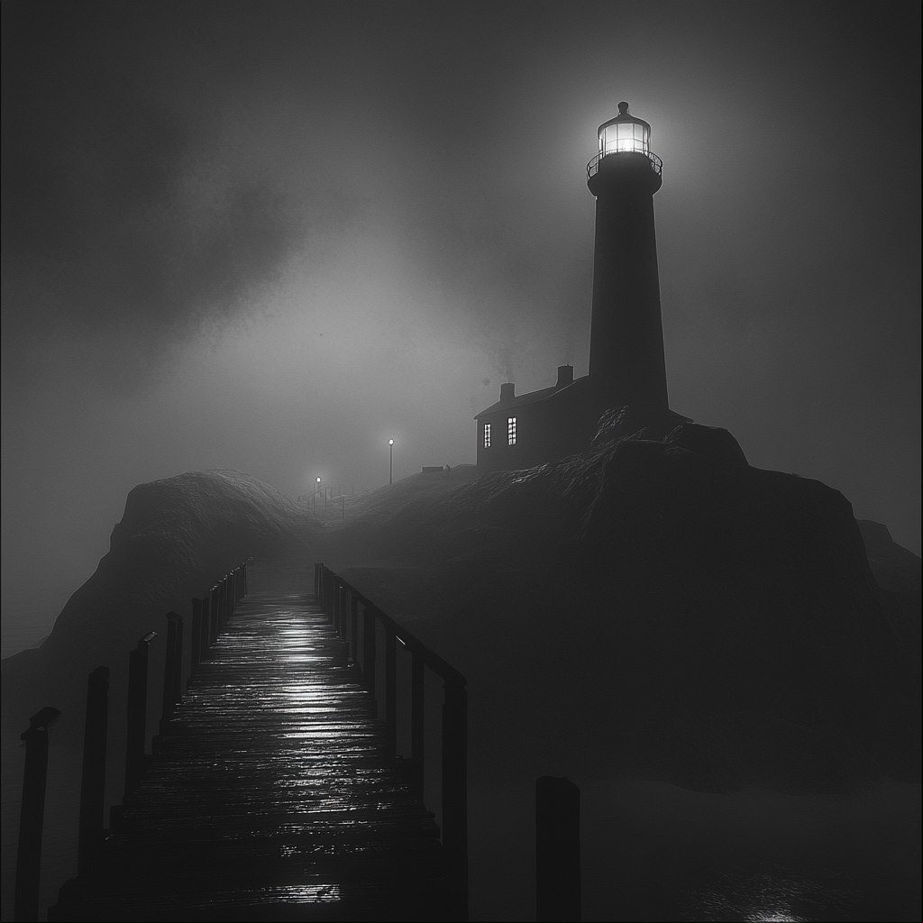 Создано на основе запроса: 16:9, widescreen format, screenshot of videogame, black and white, robert eggers style, noise and grain: An image of a lighthouse that's off, it's foggy and night, looks like an old film, you're standing on a dock, first person view, the island is all rock, there's also a cabin with lights on inside. --- Автоперевод: 16: 9, широкоэкранный формат, скриншот видеоигр, черно -белая, стиль Роберта Эггерса, шум и зерно: изображение маяка, который выключен, это туманное и ночь, выглядит как старый фильм, вы стоите на причале, вид от первого лица, остров - это камень, есть также кабина с огнями внутри. Как тебе этот вариант? 🤔 https://dzen.ru/id/65c0c65c86e4f837c27b24d7 #ИИ #AI #нейросеть #midjourney #art