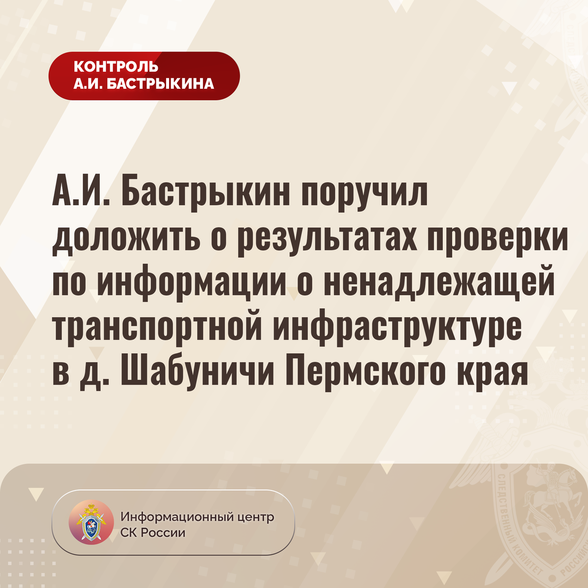 А.И. Бастрыкин поручил доложить о результатах проверки по информации о ненадлежащей транспортной инфраструктуре в д. Шабуничи Пермского края В эфире федерального телеканала сообщалось, что в деревне Шабуничи Пермского края на протяжении длительного времени единственная дорога, соединяющая населенный пункт с райцентром, находится в непригодном состоянии: асфальтовое покрытие отсутствует, при выпадении осадков и таянии снега грунтовое полотно размывается. В результате передвижение автомобилей, в том числе транспортных средств экстренных служб, затруднено. Так, 10 апреля текущего года бригада скорой помощи не смогла транспортировать пациента в медицинское учреждение. Многочисленные обращения граждан результатов не принесли, меры к организации транспортной инфраструктуры не принимаются. Ситуация также широко освещается в других СМИ. В СУ СК России по Пермскому краю по данному факту организована процессуальная проверка. Председатель Следственного комитета Российской Федерации Александр Иван