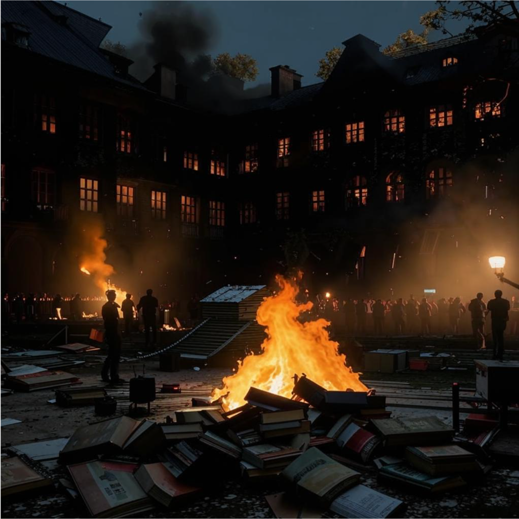 Александра побежала вниз по лестнице. Во дворе университета горел костёр. В пламени исчезали книги, дипломы, диссертации. Рядом стояли люди в чёрной форме.