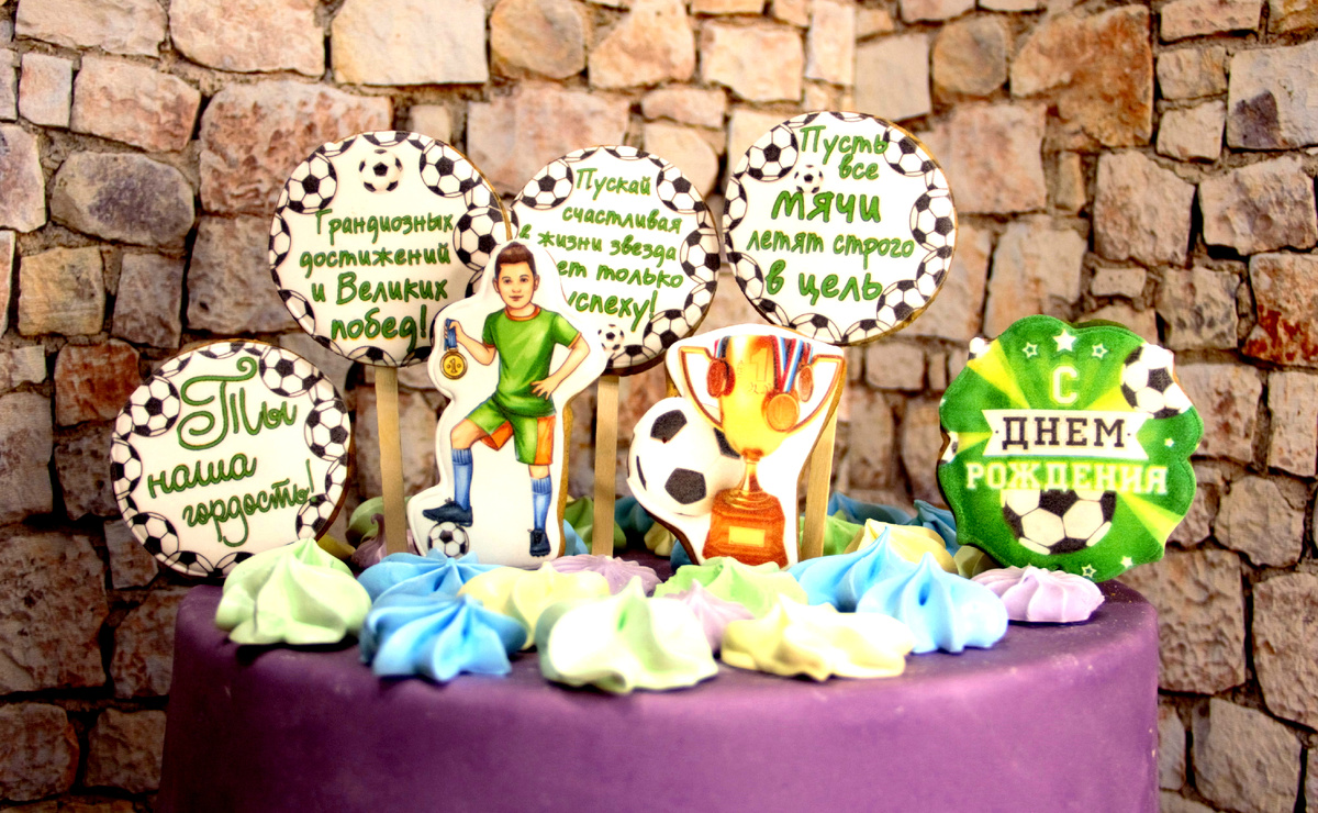 Для любого ребёнка не будет большей радости, чем вкусный тортик на День Рождения который Вы приготовили сами или приобрели, но главное украсили его натуральными имбирными пряниками в тематике - Футбол. Наша кондитерская представляет Вам готовый пряничный набор, который Вы всегда можете приобрести на маркетплейсе WB (артикул 200567395, артикул 342780341). Набор состоит из 7 имбирных пряников, а так же в комплект входят безопасные шпажки из натуральной берёзы с закруглёнными окончаниями с каждой из сторон. Основная фигурка композиции - мальчик футболист с мячом и медалью в руке. Размер 8,5 см в высоту. Прекрасно дополняют композицию пряники круглой формы 7 см с надписями в виде пожеланий: "Ты наша гордость", "Пускай счастливая в жизни звезда ведёт только к успеху", "Пусть все мячи летят строго в цель", "Грандиозных достижений и Великих побед" Не обойтись в данном случае конечно же без самого поздравления "С Днём Рождения" выполненного на прянике в виде рамки 7 см и кубком победителя так