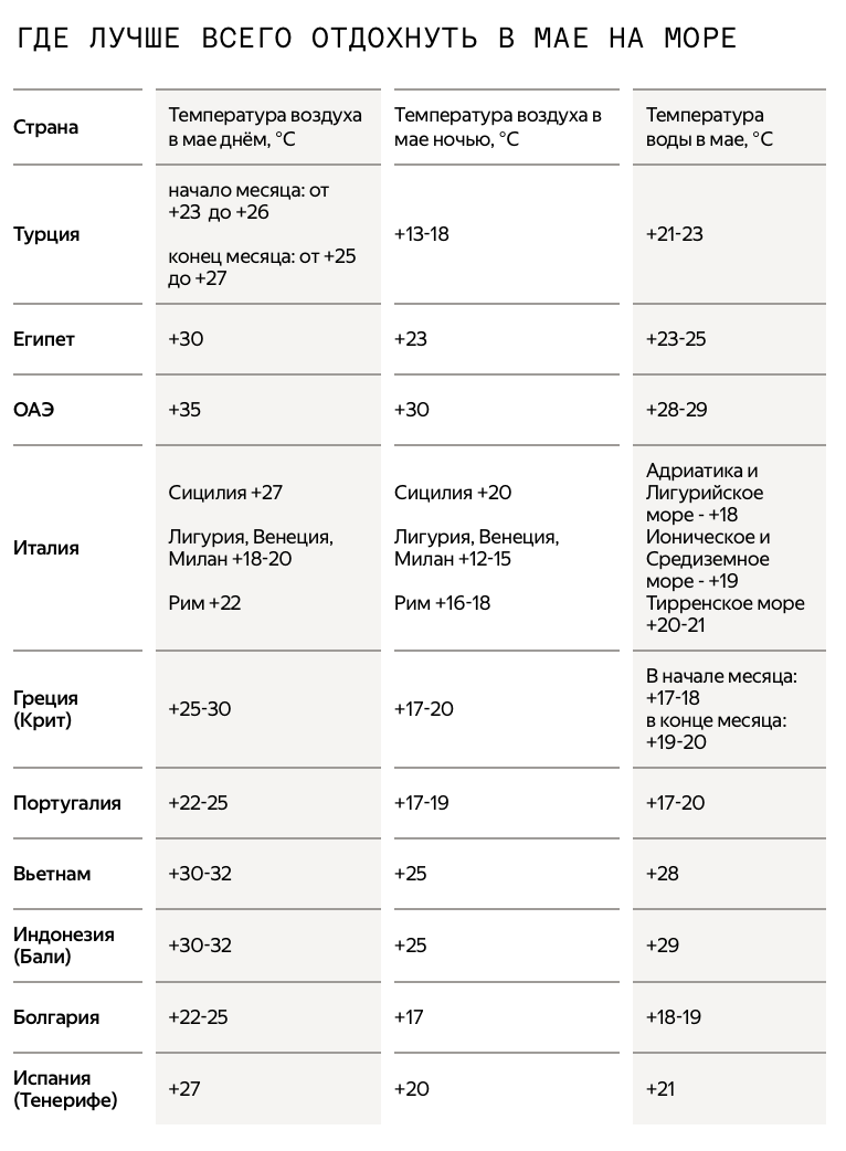 В мае нельзя обойтись без трёх лидеров пляжного отдыха среди россиян: Турции, Египта и Объединённых Арабских Эмиратов. Оно и понятно: въезд в эти страны безвизовый, есть прямые перелёты, цены весьма приятные, да и лететь не так долго. А май — первый месяц летнего сезона в этих странах.