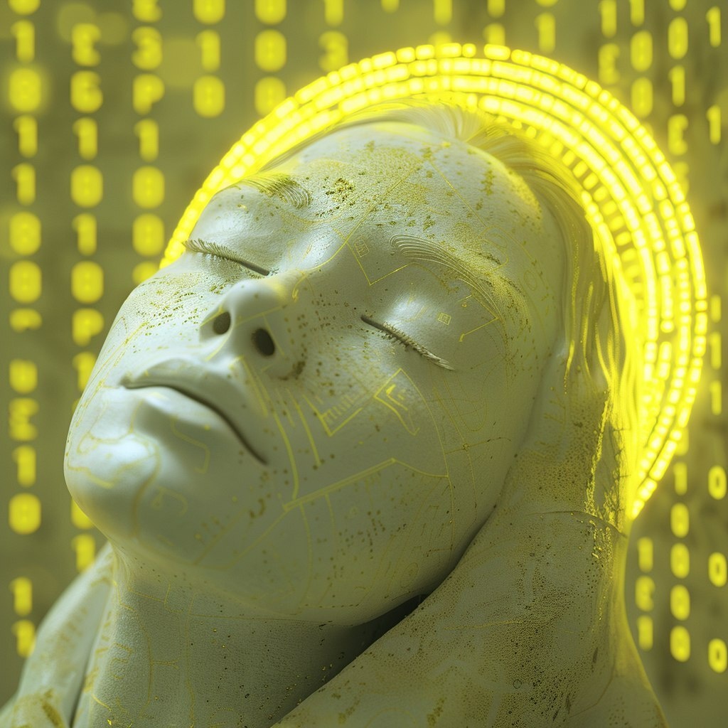 Автоперевод: Персонаж, белый каменный женщина, близкий взгляд на ее лицо, желтый фон с белыми числами, как в матрице, желтый светодиодный ореол, сновидения, ее глаза закрыты