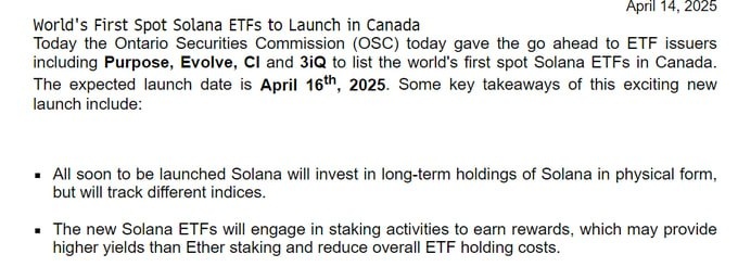 ✔️ Регуляторы Канады одобрили листинг спотовых Solana ETF с 16 апреля