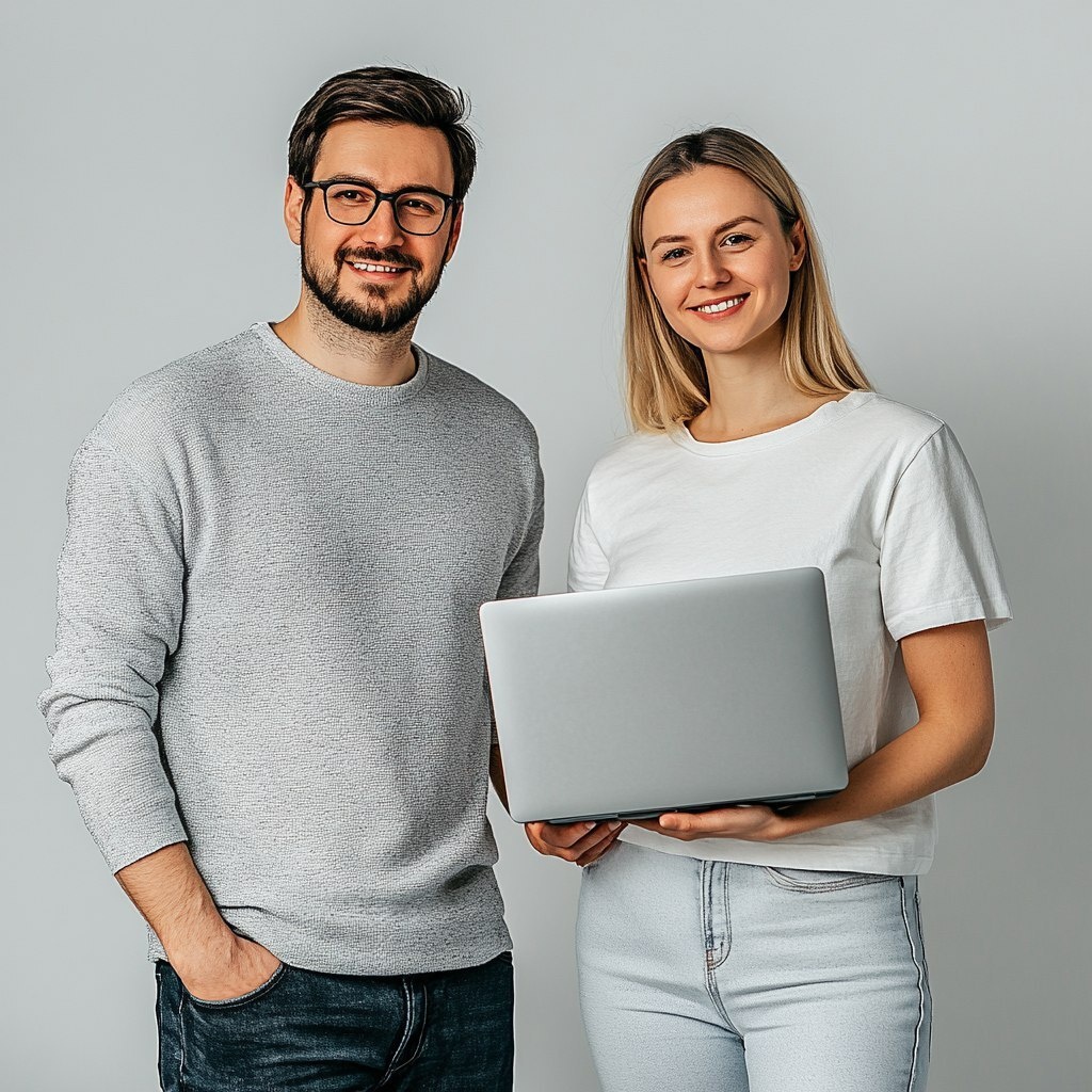 Создано на основе запроса: A realistic photo of 30y.o. german man and woman, to the knees, smiling , wearing casual (gray or white), man holds the laptop, modern clean look, front view, bright lighting, no background, professional photography, shot on Canon EOS 5D, ultra-realistic --- Автоперевод: Реалистичная фотография 30y.O. Как тебе эта иллюстрация? 🤔 https://dzen.ru/id/65c0c65c86e4f837c27b24d7 #ИИ #AI #нейросеть #midjourney #art