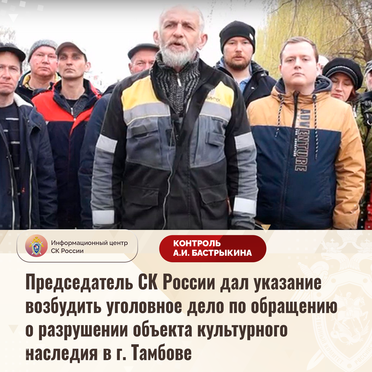 Председатель СК России дал указание возбудить уголовное дело по обращению о разрушении объекта культурного наследия в г. Тамбове В социальной сети размещено видеообращение к Председателю СК России А.И. Бастрыкину от жителей города Тамбова о несогласии с результатами установления обстоятельств разрушения объекта культурного наследия регионального значения – жилого дома по улице Советской. В ноябре прошлого года коммерческая компания, руководителем которой является местный депутат, под предлогом подготовки к реконструкции произвела снос здания. Заявители отмечают, что на территории населенного пункта регулярно происходят поджоги и разрушения охраняемых объектов, при этом меры к их консервации и последующему восстановлению не принимаются. Указанное может повлечь уничтожение исторического облика города. В СУ СК России по Тамбовской области по данному факту проводилась процессуальная проверка. Председатель Следственного комитета Российской Федерации Александр Иванович Бастрыкин дал указание