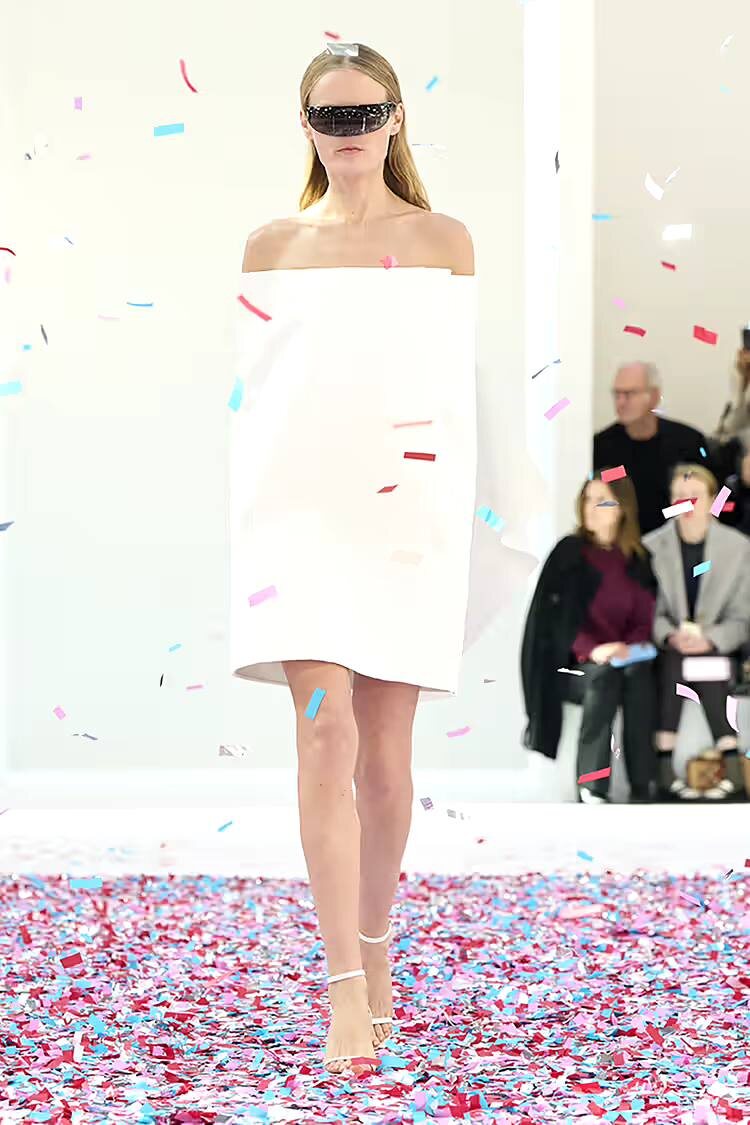 А вот бренд Courrèges выдал эффектную подачу, как по мне, слабой коллекции. Конфетти, безусловно, привлекают, я бы посмотрела на этот рай для принцессы вживую. А вот сама одежда вызывает вопросы. Вроде и немного классика, и немного деконструкция в лекалах, и немного актуальных оттенков, и немного «трендовых» тканей. И все равно выглядит неуместно, что ли. Как будто хочется поработать не только над концептом самого показа, но и над айдентикой бренда. Может, стоило сохранить и переосмыслить идею футуризма, которая была присуща бренду ранее. Даже коллекция fw23 вышла намного интереснее (2 последних фото) Судите сами