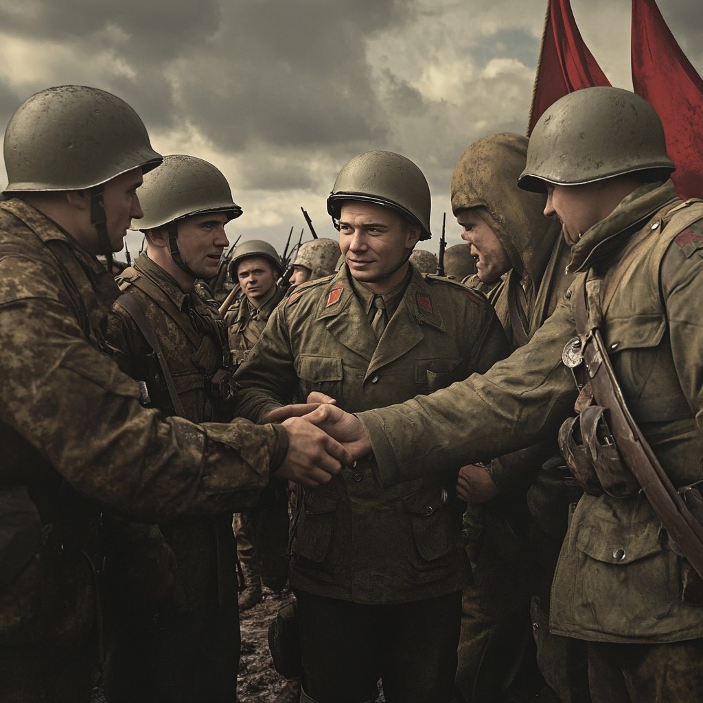Создано на основе запроса: Several Russian soldiers in 1945 reach out to shake hands in the left part of the picture, realism, light photo