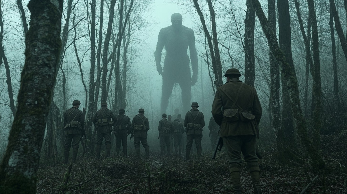 Создано на основе запроса: A group of French special forces soldiers in 1917 uniforms stand alert in a misty forest near Verdun. Their uniforms are worn and dirty from days in the field. Leading them is Captain Armand Salazar, holding his rifle tightly, eyes wide with tension as he stares into the trees. The forest is dense and shadowy, with twisted old trees stretching upward through a thick, creeping fog. The air feels heavy and still. Just beyond the tree line, partly hidden by the mist, stands a tall, strange figure humanoid in shape, with long arms, smooth gray skin, and no visible eyes. The creature doesn’t move, but its presence is deeply unsettling. A pale, cold light filters through the branches, casting eerie shadows and creating a haunting, silent atmosphere.