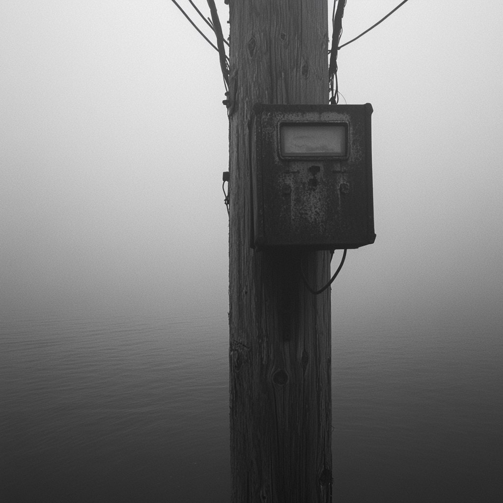 Создано на основе запроса: Style: 16:9, black and white, Robert Eggers style, foggy, grainy, POV, point of view, eye level, Scene: you are looking at a wooden hydro pole, on the pole is a rusty power box, it's very dark, it's night, there are wires hanging out, behind the box and pole is the dark still ocean