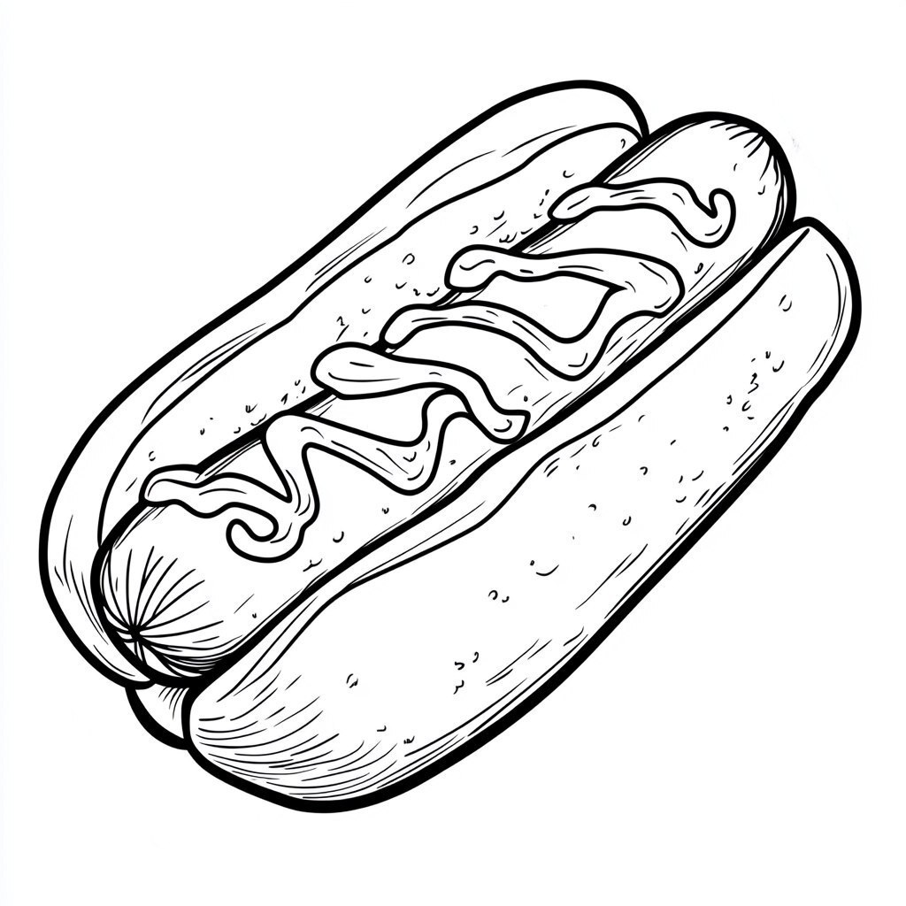 Создано на основе запроса: Kids Coloring page, a cartoon hot dog, black outline, white background, thick lines, no shading, Cartoon style