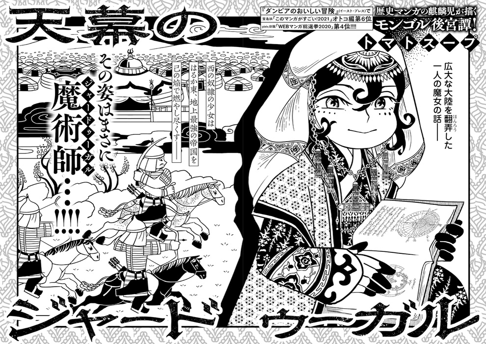 Популярная манга «Жизнь ведьмы в Монголии» (天幕のジャードゥーガル / A Witch's Life in Mongol) будет экранизирована в виде аниме-сериала. Над проектом работает анимационная студия Science Saru; опубликован первый видеотизер. Сюжет этой исторической придворной драмы разворачивается в Монголии XIII в. Главные героини — реально существовавшие Ситара (Фатима), талантливая женщина персидского происхождения, проданная в качестве рабыни в Монгольское государство, и Тёрегене, шестая жена хана Угедея (сын Чингисхана). Тёрегене производит Фатиму в советницы, и сообща они начинают перестраивать основы центральноазиатской империи... Предварительно изучив исторические манускрипты, мангака Tomato Soup отталкивается от тамошних иллюстраций и специально рисует персонажей в слегка карикатурной манере. Манга выходит на цифровой платформе «Суфле» издательства «Акита», на сегодня в Японии также доступно четыре печатных танкобона. В 2022 г. «Жизнь ведьмы...» заняла первое место в категории «женская манга» рейтинга «К