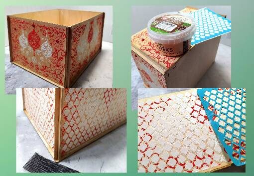 Когда мне в руки попадают деревянные коробки, я стараюсь превратить их в полезные вещи для хранения. В этот раз мне принесли ящик из тонкой фанеры. На первый взгляд, он кажется совершенно ненужным, и непонятно, как его можно использовать. К тому же, в некоторых местах фанеру повело, особенно сильно пострадала крышка. Однако, поразмыслив, я решила, что можно оформить только сам ящик. Для переделки понадобится: ящик, пластиковая крышка от сыра, шпатлевка по дереву, трафарет, краски для окрашивания (я использовала зеленую, умбру жженую, красную,розовую, золотую и медную), лак акриловый, клей ПВА, клей, который сможет приклеить пластиковую крышку, горячий пистолет, самоотвердевающая глина, молды, бусы для елки, шариковая цепочка (её можно заменить на нитку с нанизанным бисером), небольшие полубусины, четыре больших полубусин, фетр. Первым делом я осмотрела ящик и сняла приклеенные стразы. В этом ящике лежал новогодний подарок, и сам ящик был украшен в праздничном стиле. Местами можно было