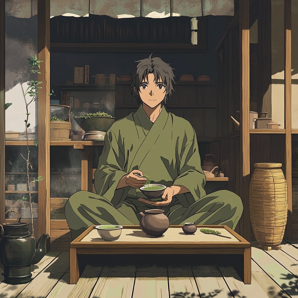 Создано на основе запроса: an anime image of a tea master making a cup of matcha he is sitting in front of a table with the matcha cup on