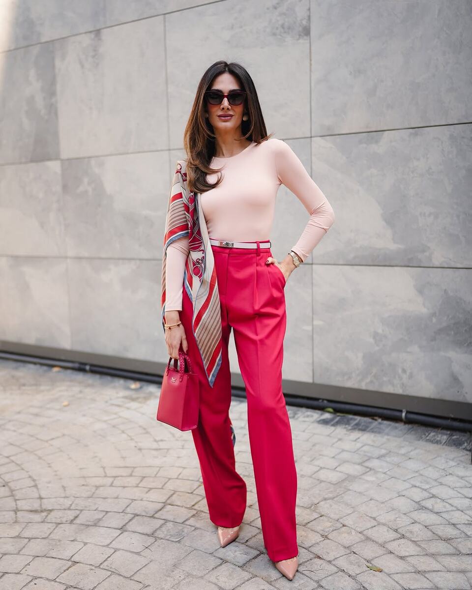 Как понять, что женщина уверена в себе, знает цену вещам и умеет пользоваться стилем? Иногда достаточно одного взгляда на её образ. В этой статье — 10 комплектов, которые выглядят не просто дорого, а изысканно и сдержанно. А ещё — советы, как собрать такие образы самостоятельно. Нежный лонгслив и яркие брюки с высокой посадкой создают эффект дорогой простоты. Платок на плечах, сумка и лодочки в тон делают образ цельным. Как повторить: выбирайте гладкие фактуры, брюки с защипами и ремнём, платок из шелка или атласа. Лучше всего подойдёт фигуре с талией — песочные часы, прямоугольник, груша. А дальше вы узнаете, как добавить образу статусности — даже в классике, где всё строго и чёрно-белое. Белый брючный костюм с контрастным воротником и чёрным топом — минимализм, который притягивает взгляд. Но всё решает обувь: леопардовые лодочки с острым носом говорят о вкусе и уверенности. Как повторить: белый костюм — база, но важны детали: посадка по фигуре, плотная ткань, идеальные стрелки. Хоро