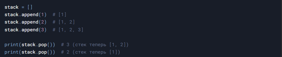 Стек — это структура данных, работающая по принципу LIFO (Last In, First Out), где последний добавленный элемент извлекается первым. В Python стек можно реализовать разными способами, и в этой статье мы рассмотрим основные методы, примеры кода и практическое применение. Стандартный список в Python идеально подходит для реализации стека. Для этого используются два метода: - push() → append(): добавление элемента в конец списка. - pop(): удаление и возврат последнего элемента. Пример: Для удобства можно создать класс, инкапсулирующий логику стека: - Push: Добавление элемента на вершину стека. - Pop: Удаление и возврат верхнего элемента. - Peek: Просмотр верхнего элемента без удаления. - isEmpty: Проверка на пустоту. - Size: Получение текущего размера стека. Для больших объемов данных эффективнее использовать `deque`, оптимизированный для быстрых операций с обоих концов: Подходит для многопоточных приложений, но менее эффективен в однопоточных из-за блокировок: 1. Отмена операций (Undo):