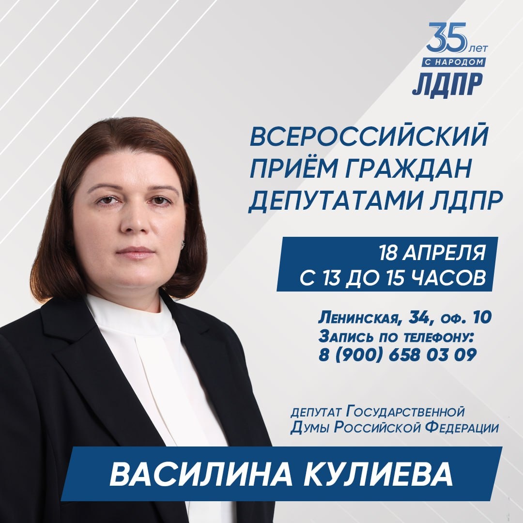 Попасть на прием к депутату Государственной Думы могут жители Камчатки Депутат Государственной Думы России от ЛДПР Василина Кулиева приедет на Камчатку на этой неделе. Она проведёт приём граждан в региональном штабе партии. Попасть на приём может любой гражданин, но необходима предварительная запись по телефону: 8 (900) 658 03 09. #ЛДПР #ВсероссийскийПриём #ПриёмГраждан #ГосударственнаяДума
