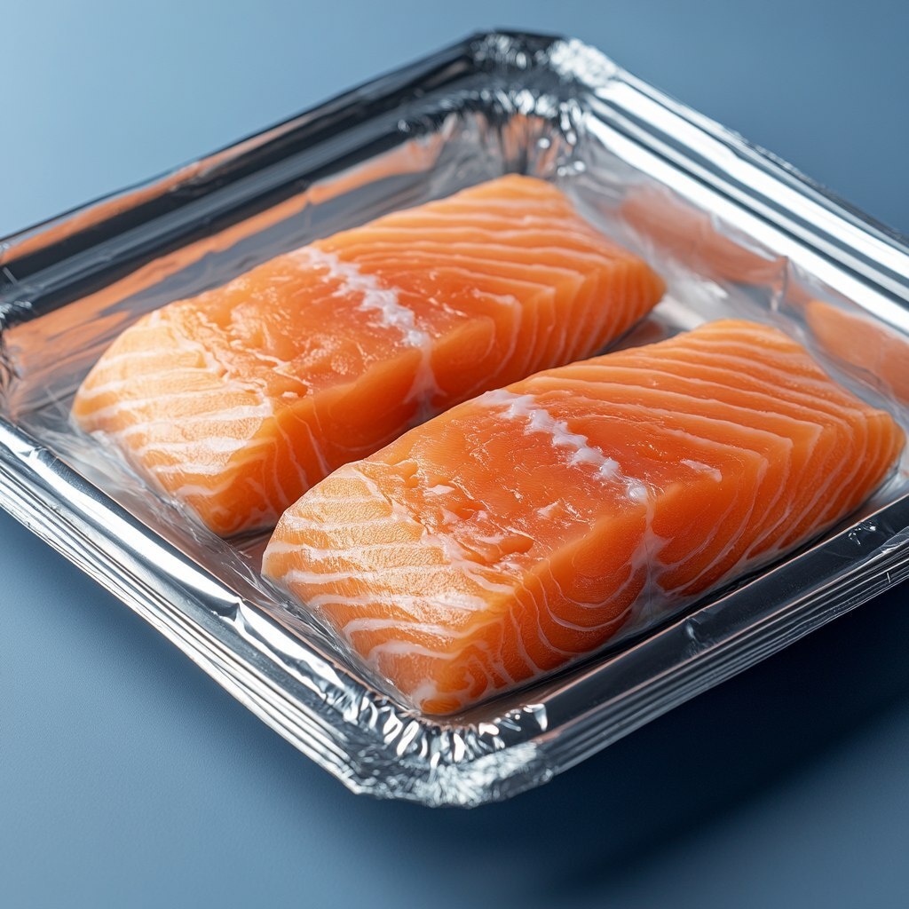 Создано на основе запроса: a fresh salmon fillet in transparent vacuum-sealed packaging, placed inside a slightly open thermal delivery box