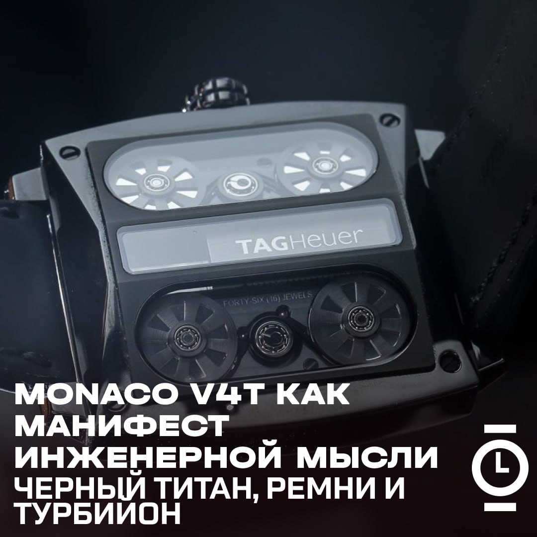 ЧЕРНЫЙ ТИТАН, РЕМНИ И ТУРБИЙОН: MONACO V4T КАК МАНИФЕСТ ИНЖЕНЕРНОЙ МЫСЛИ #обзор_WD В 2025 году модель TAG Heuer Monaco V4 Tourbillon остаётся одной из самых технически смелых разработок марки — даже спустя более 10 лет после премьеры. Это первые в мире часы с турбийоном, приводимым ремнём, а не традиционной анкерной системой. Уникальный механизм сочетает эстетику автомобильного двигателя с высокой часовой инженерией. История модели началась в 2004 году с дебюта концепта Monaco V4 — проекта, который тогда не работал. Только к 2009 году усилиями инженера Ги Семона часы удалось довести до серийной версии. Турбийонная модификация V4T появилась в 2014 году и стала символом технического прорыва TAG Heuer. Monaco V4T оснащены автоматическим механизмом с четырьмя барабанами, установленными на шарикоподшипниках, и необычной системой подзавода с линейным грузом вместо классического ротора. Турбийон здесь вращается с помощью ремня толщиной всего 0,07 мм, что делает его движение особенно плавн