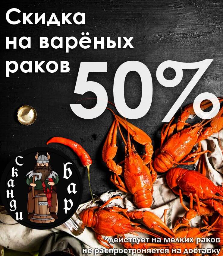 Сканди Бар -Скидка на варёных раков - 50% Акция действует каждую среду !(Действует на мелких раков, не распространяется на доставку. )