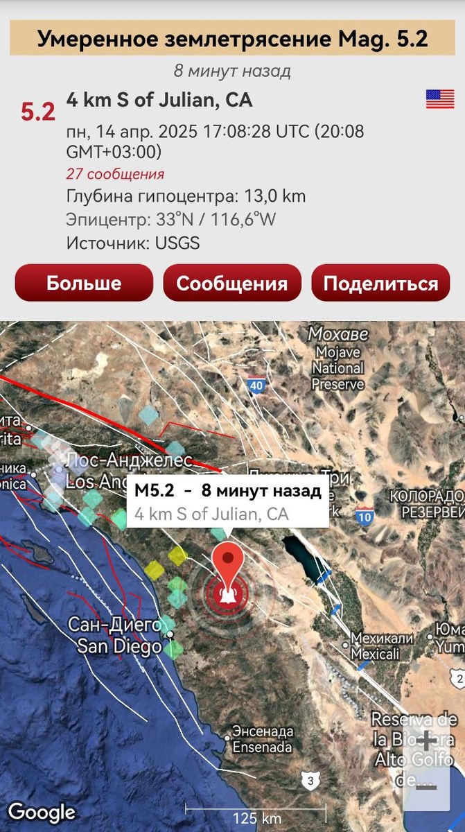 В ответ на пост Калифорния отработала ощутимым событием М5.2 через 4 дня после предупреждения от 12 апреля. ОСТИ давал магнитуду до М6+, так что еще легко отделались. === California felt the M5.2 earthquake 4 days after the April 12 warning.