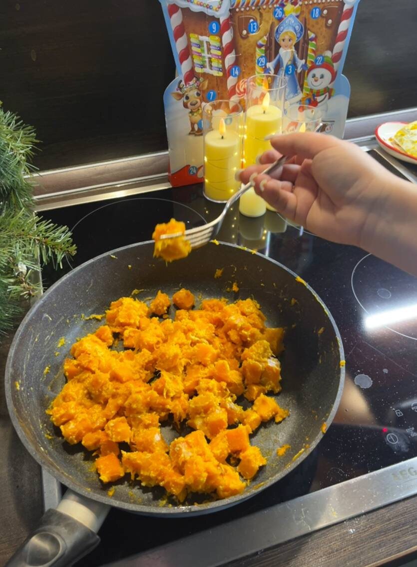 ◦ На разогретую сковородку добавить оливкового масла и отправить тыкву к нему
