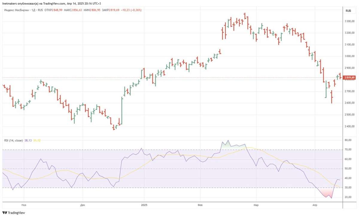 ❗️14 апреля российский фондовый рынок снизился, индекс МосБиржи подешевел на 0,36% до уровня 2819,69