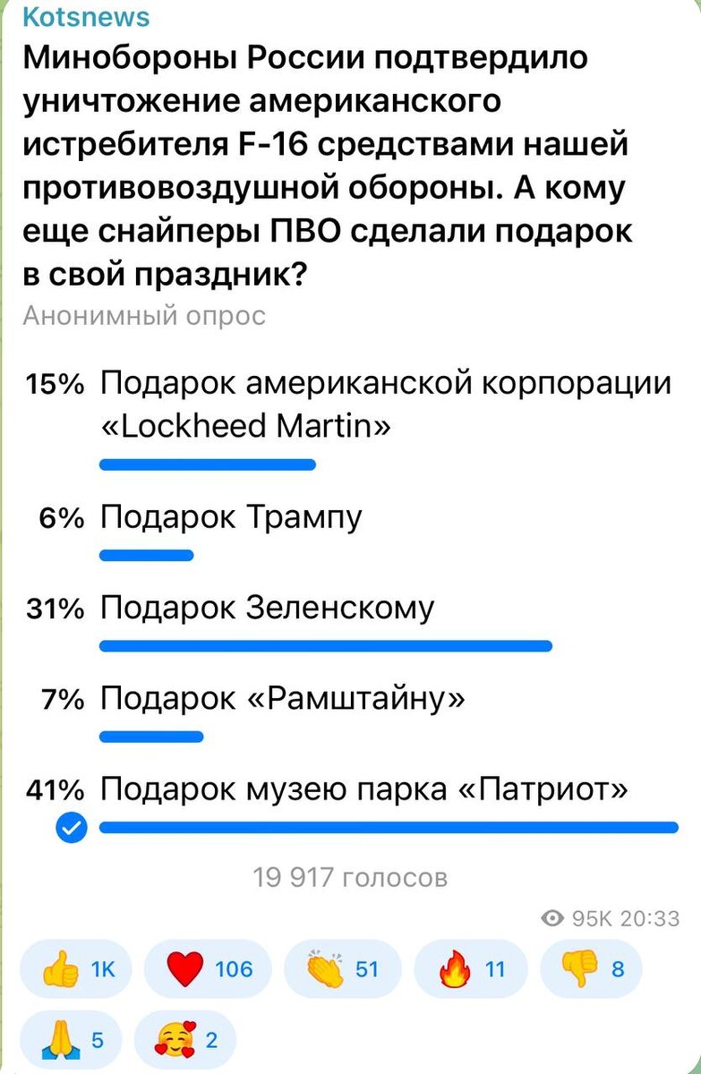 41 процентов проголосовавших считают, что наши зенитчики сделали подарок музею парка «Патриот». Правда, обломки этого «подарка» еще только предстоит собрать.