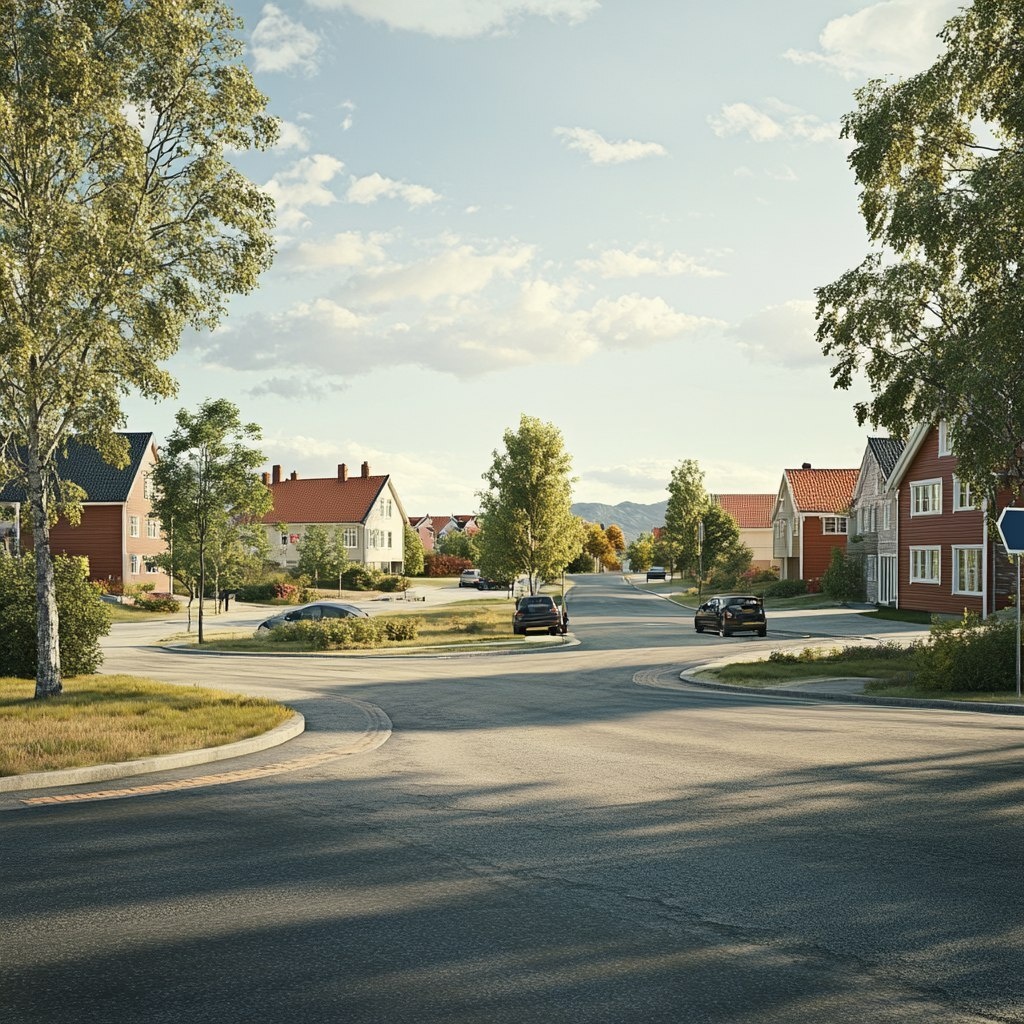 Создано на основе запроса: Car road intersection street in a residental area, daytime, country: Norway, no traffic at all, realistic picture