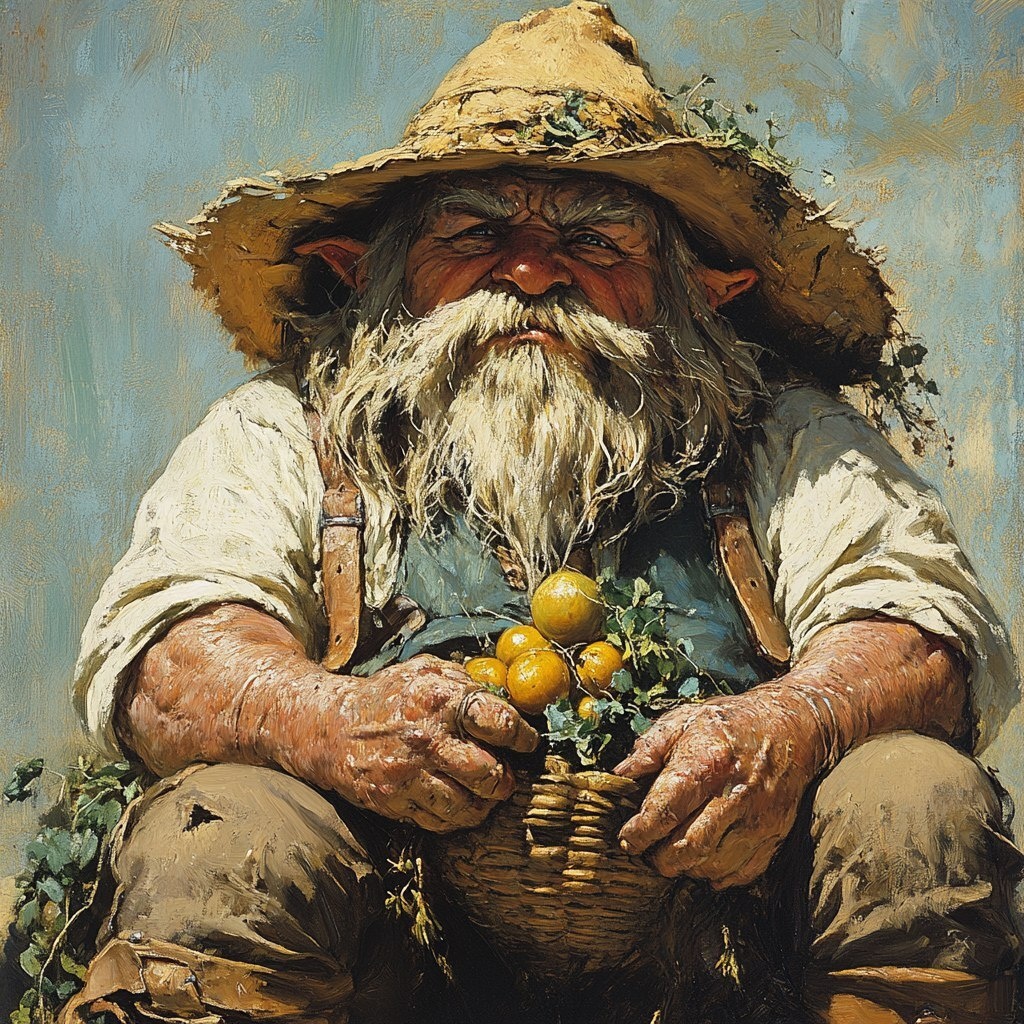 Создано на основе запроса: a classic 1970s fantasy novel cover drawing of a stocky grumpy halfling farmer barbarian