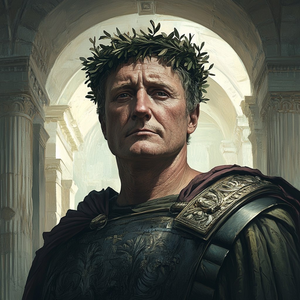 Создано на основе запроса: A detailed portrait of an ancient Roman man wearing a laurel crown, with a proud and noble expression