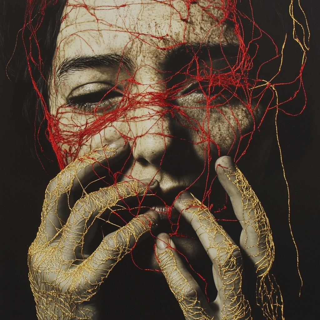 Создано на основе запроса: : A portrait with the figure’s body or face stitched together with gold, red, or glowing thread. Some of the thread is unraveling, some is frantically knotted, and some is soft and soothing. Their hands may be mid-stitch, still trying to put themselves back together. Conveys fragility, healing, self-effort that fine line between comfort and coming undone. --- Автоперевод: : Портрет с телом фигуры или лицом, сшитым с золотой, красной или светящейся нитью. Круто выглядит? 🤔 https://dzen.ru/id/65c0c65c86e4f837c27b24d7 #ИИ #AI #нейросеть #midjourney #art