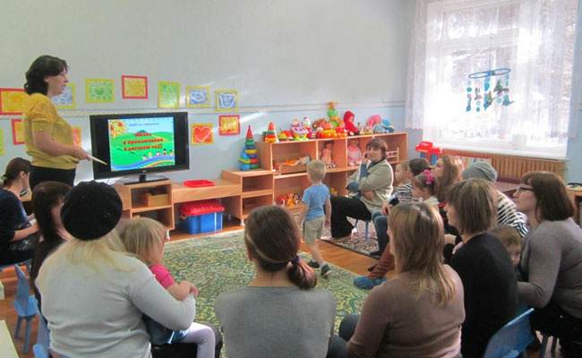 Мамы сидят на ковре, а дети — спиной к ним.