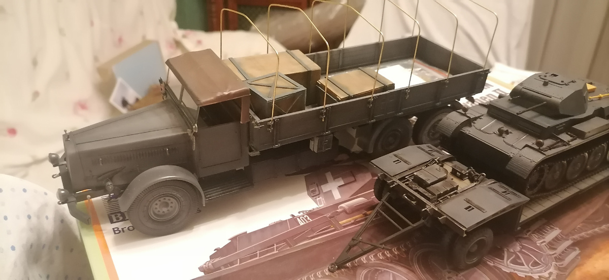 Всех приветствую! Ну что же.. На горизонте финал того что длилось несколько месяцев. Да, по масштабам это не Лунь, но тем не менее тоже интересная связка. В принципе все готово, остались только декали и под лак. С танком: закрепить инструмент, нанести декали и так же под лак... Машина пойдет на диораму которую сделаю в виде угловой полки. Позже эту картину дополню или кюбельвагеном или ганомагом в 1:35. Может даже еще чем. Ибо варианты разные есть. Задача что нибудь поставить в кузов грузовика. И думаю мы с этой задачей справимся.